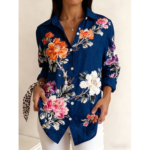 Per donna Camicia Floreale Elegante Casual Manica Lunga Colletto a Camicia Top Regolari Lavoro Quotidiano Ferie Bottoni Stampato Blu marino Primavera Autunno