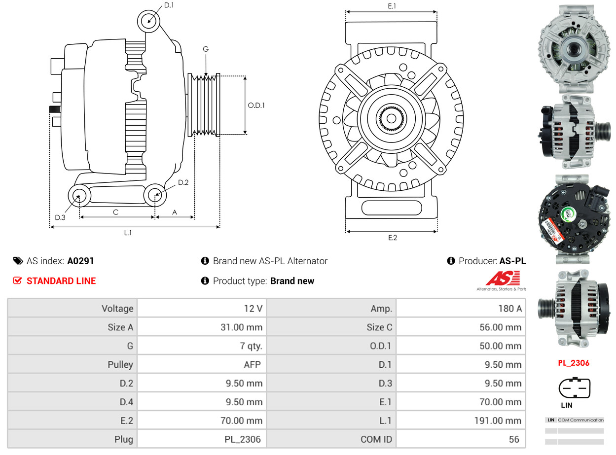 AS-PL Generator A0291 12V 180A für MERCEDES-BENZ 642154040283 A000906270080 000906270083