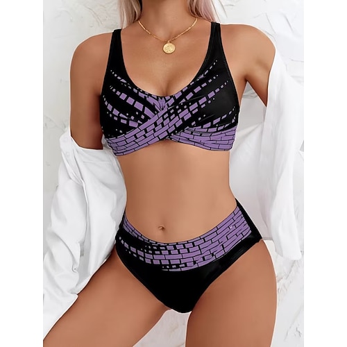 Costume da bagno a bikini da donna 2 pezzi vita alta moda elegante grafico a righe collo a V senza maniche costumi da bagno