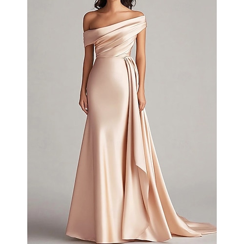 Abito da Sera A-Line Abito Elegante Matrimonio Formale Strascico senza Maniche Spalle Scoperte Vestito da Damigella in Raso con Spacco Arricciato