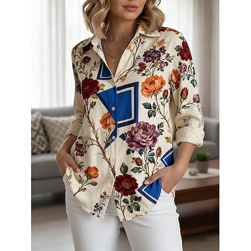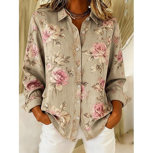 Per donna Camicia Floreale Grafico Elegante Casual Manica Lunga Colletto a Camicia Top Regolari Lavoro Quotidiano Ferie Bottoni Stampato Beige Primavera Autunno