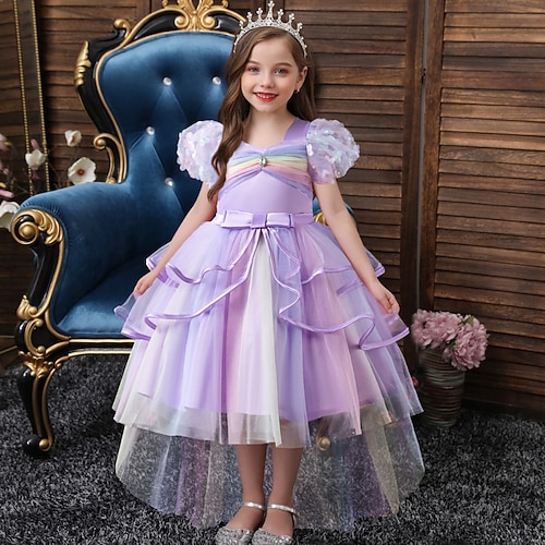 Abito da damigella d'onore bambina Ragazze Abito formale Abiti da sposa Feste Matrimonio Formale Moda Adorabile Principessa Patchwork Rete Arcobaleno Maniche Corte Colletto quadrato Blu Giallo Dai 4