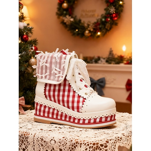 stivali da donna con plateau e lacci a quadretti rossi – adorabile stile retrò con dettagli in pizzo e motivo a quadri per Natale, Lolita e festività invernali