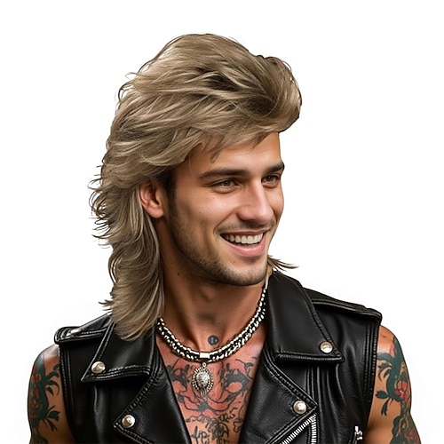 parrucca da uomo stile mullet rock anni '80, acconciatura retrò castana per cosplay e feste moda d'epoca
