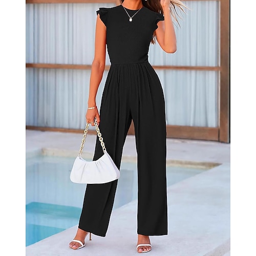 Per donna Tuta Attivo Tinta unica Senza Maniche Gamba larga Girocollo Volant Tasca Quotidiano Vacanza Vestibilità regolare Nero Blu marino Primavera