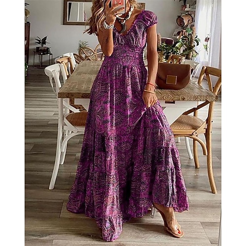 Per donna Abito Lungo Maxi Abito Vestito Casual Abito Estivo Moda All'aperto Feste Ferie Vestibilità regolare Fiore Manica Corta Scollo a V Blu Giallo Viola Marrone Estate