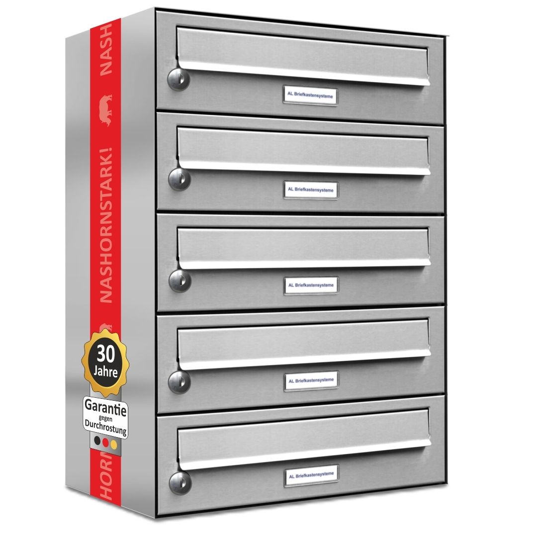 AL Briefkastensysteme 5 Fächer Premium Edelstahl Wand Briefkasten Anlage für Post A4, modern, robust und wetterfest, Artikelnummer: 132T5EA1