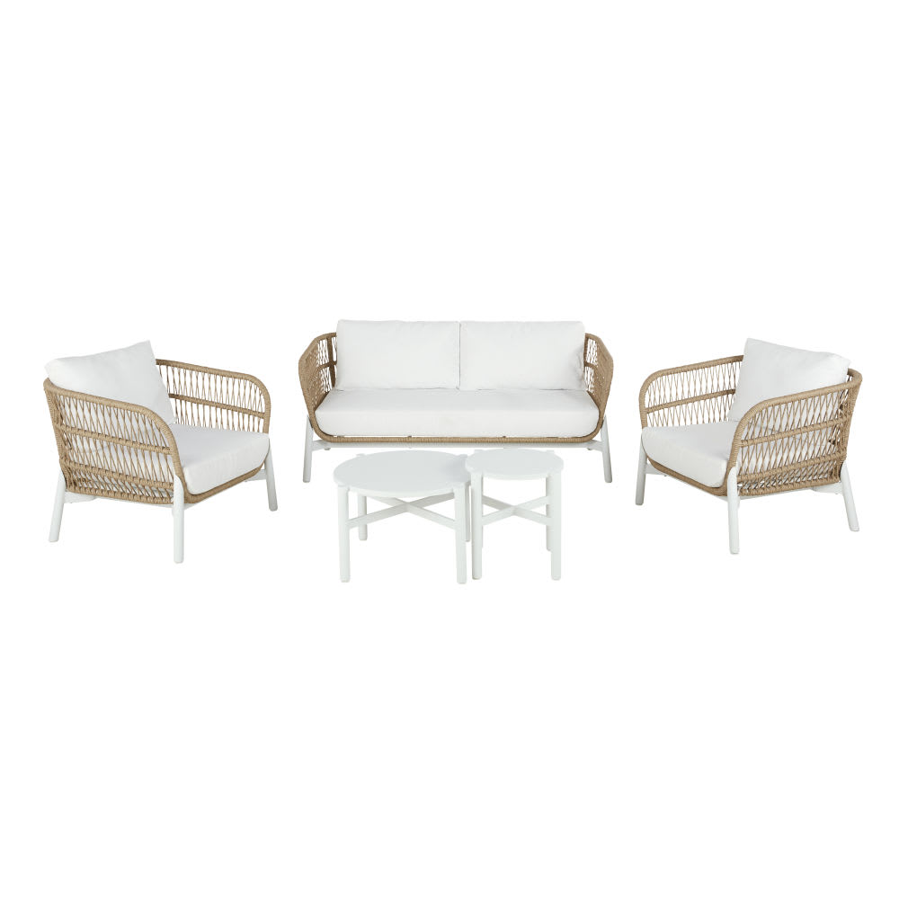 Salotto da giardino 4 posti in resina intrecciata effetto rattan e cuscini bianchi
