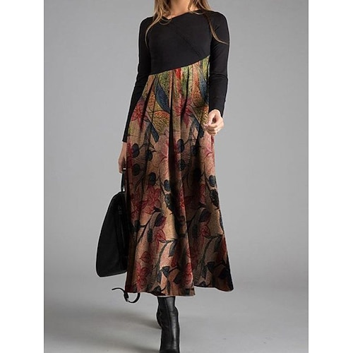 Per donna Abito Midi Abito a trapezio Casual Quotidiano Vestibilità regolare Grafico Geometrico Blocco di colori Manica Lunga Scollo a V Marrone Scuro Giallo Blu Marrone Primavera Autunno Inverno