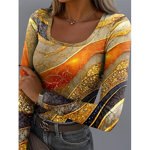 Maglietta da donna a manica lunga a coste Grafica Collo Quadrato Maglietta a manica lunga Casual Ombre Astratta Vintage Elegante Classica Top Regolari Quotidiana Stampa Blu Viola Oro Verde Primavera
