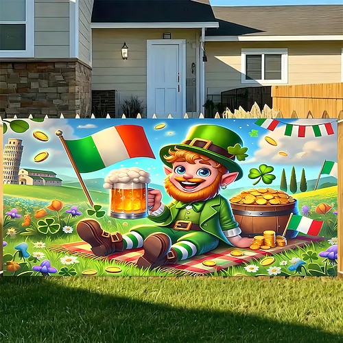 bandiera irlandese verde per il giorno di San Patrizio, trifoglio disegno di folletto, decorazione per feste in giardino, tessuto per fondale fotografico, dettagli dorati per la celebrazione di San