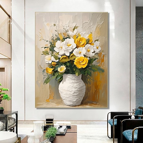 dipinto a olio originale dipinto a mano con fiori bianchi e gialli, grandi dipinti floreali di fantasia con texture, arte murale verticale, arte personalizzata, decorazione murale moderna per sala da