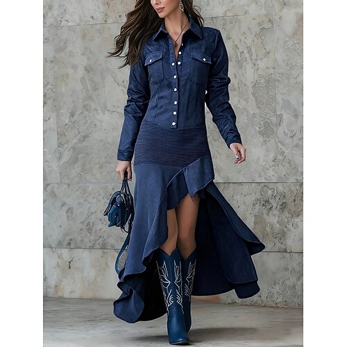 Per donna Abito maxi Vestito Casual Attillato Abito in finta pelle scamosciata Elegante Moda Moderno All'aperto Vacanza Uscire Vestibilità regolare Semplice Manica Lunga Colletto a Camicia Blu Estate