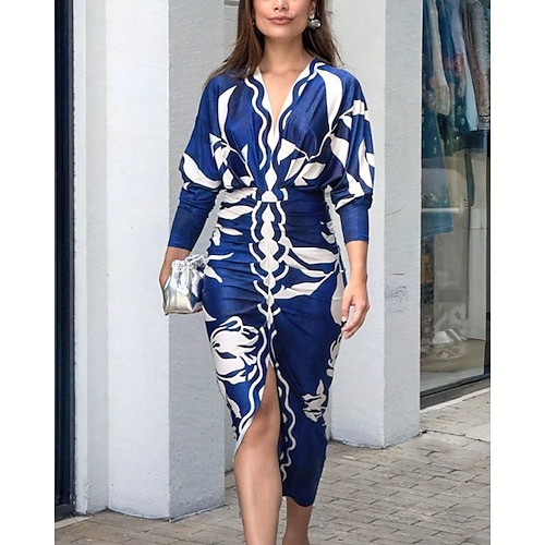Per donna Abito Midi Tubino Abito Boho Elegante Moda Moderno Quotidiano Vacanza Uscire Vestibilità regolare Floreale Grafico Manica Lunga Scollo a V Blu Arancione Estate Primavera