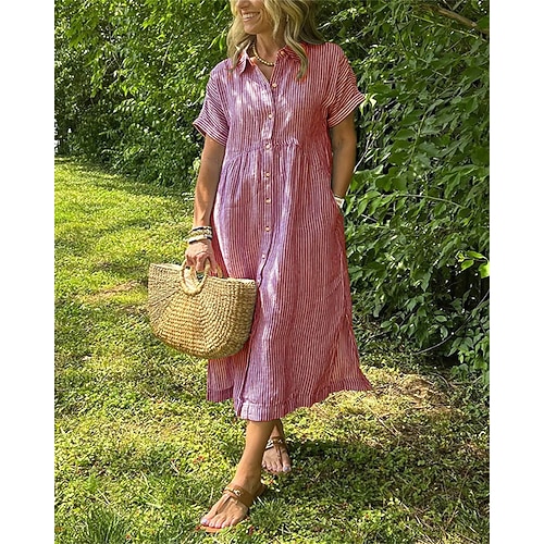 Per donna Abito Midi Abito Bianco Abito in cotone e lino Abito Elegante Elegante Vintage Moda Quotidiano All'aperto Vacanza Vestibilità comoda Semplice A righe Manica Corta Colletto a Camicia Blu