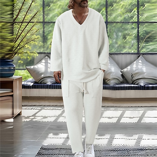 Per uomo Completi T-shirt Completi camicia e pantaloni Outfit 2 pezzi Manica Lunga Scollo a V Primavera Autunno Semplice Moda Casual Jacquard 2 Pezzi Vacanza Abbigliamento quotidiano Uscire Nero