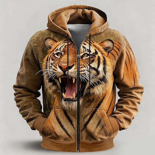 Per uomo Leone Tigre Felpa con Cappuccio Giacca di pelle Felpa Fantasia Stampa su tutta la superficie Con cerniera Vacanza Uscire Abbigliamento casual alla moda Marrone Marrone 2 Marrone 3 Cerniera