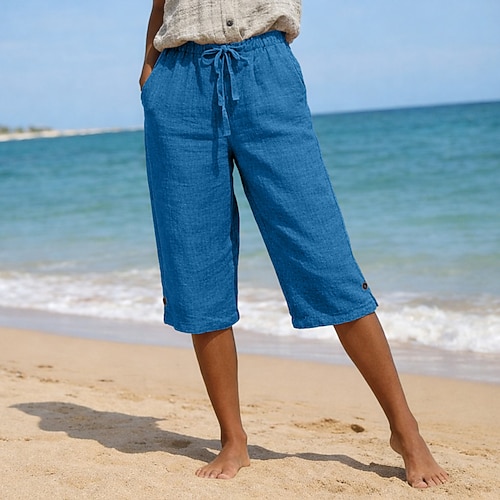 Pantaloni Capri in Cotone e Lino per Donna Pantaloni da Spiaggia Pantaloni Vacanza Casual Quotidiana Lunghezza Polpaccio Vita Alta Colore Unito Con Stringa Tasca Comfort Leggero Traspirante