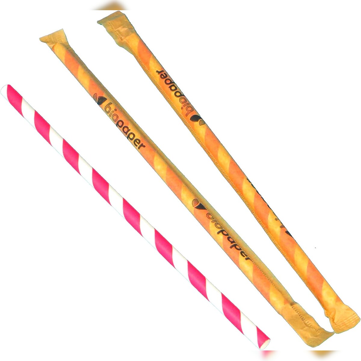 100 Papiertrinkhalme Jumbo 8mm Durchmesser 23cm lang rot weiß gestreift in Papierhülle