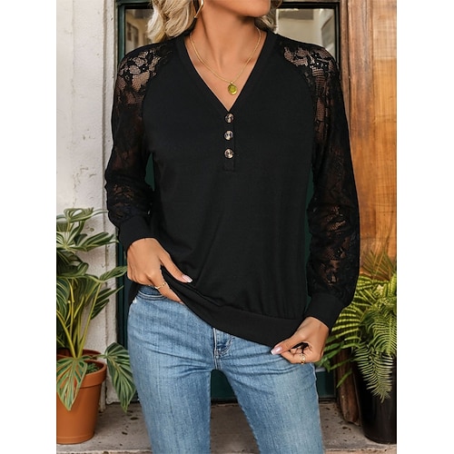 Per donna Blusa Tinta unica Elegante Casual Manica Lunga Scollo a V Top Regolari Quotidiano Pizzo Patchwork Bottoni Nero Estate Primavera Autunno