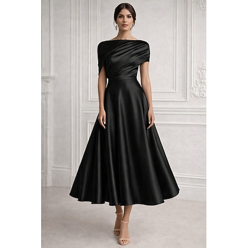 Linea ad A Lunghezza Tè Abiti da Cocktail Abiti da festa Elegante Senza Maniche Monospalla Festa in giardino Matrimonio Raso Elasticizzato con Arricciato
