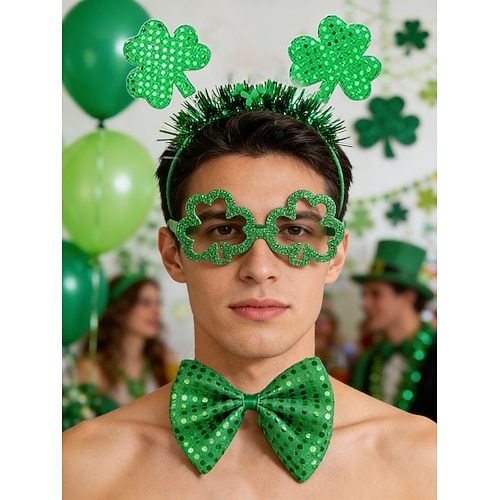 set di accessori per costume da donna per San Patrizio, composto da 3 pezzi a forma di trifoglio, fascia per capelli con occhiali glitterati abito da festa con papillon