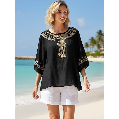 Per donna Blusa 100% cotone Floreale Elegante Essenziale Casual Manica 3/4 Girocollo Top Regolari Quotidiano Ricamato Nero Rosa Verde Estate Primavera