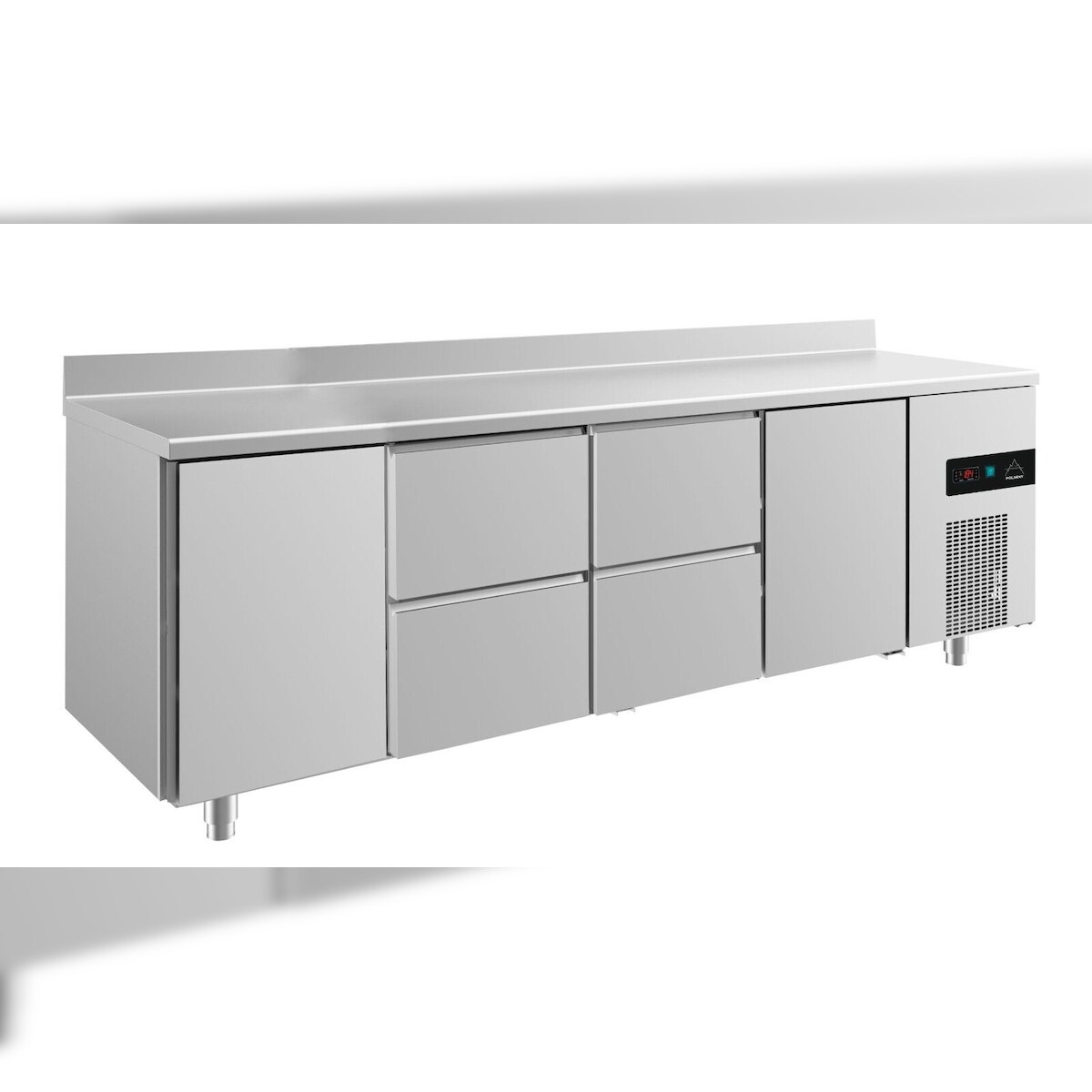A&S polarny Gastro Kühltisch 2 Türen links&rechts 4 Schubladen mittig Umluftkühlung Aufkantung, 2330x700x850mm -2/+8°C 632l