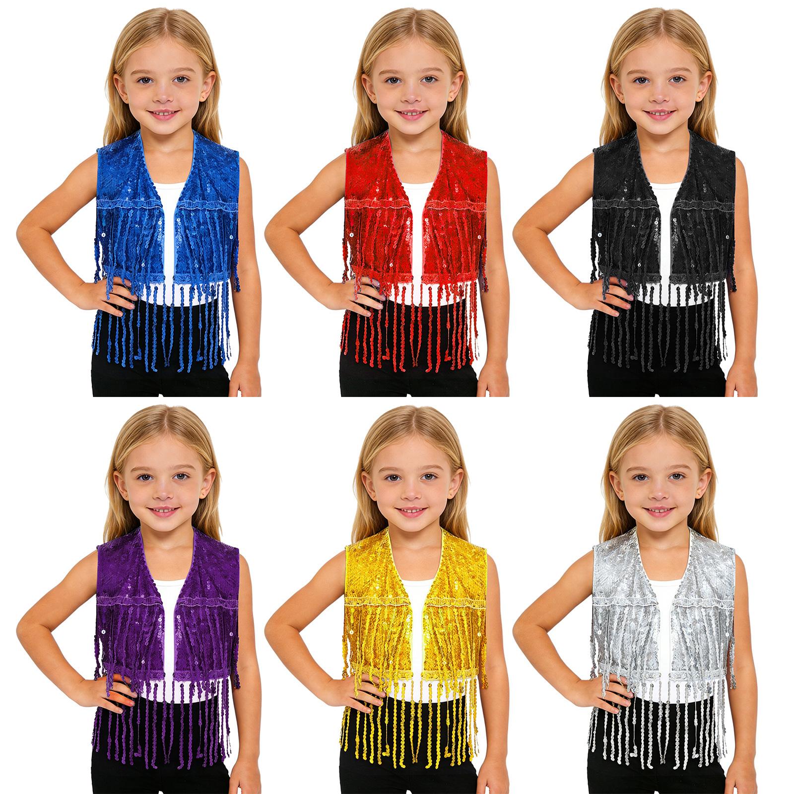 Gilet à franges pailletées pour filles: Gilet court sans manches ouvert sur le devant avec franges, Parfait pour un récital de danse et un spectacle c