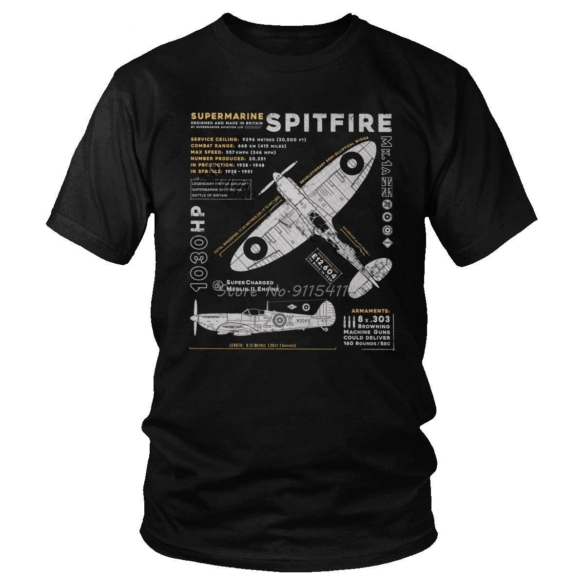 Vintage Supermarine Spitfire MK 1 T-skjorte Menn Bomulls T-skjorte Kortermet Jagerfly Krigspilot Fly Fly T-skjorte Gave cm