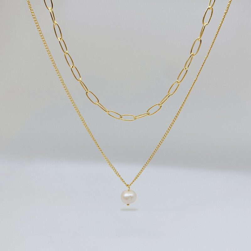 18K Gold Plated Double Layer Necklace with Pearl Pendant, 16/20 Inch Layered Link Chain