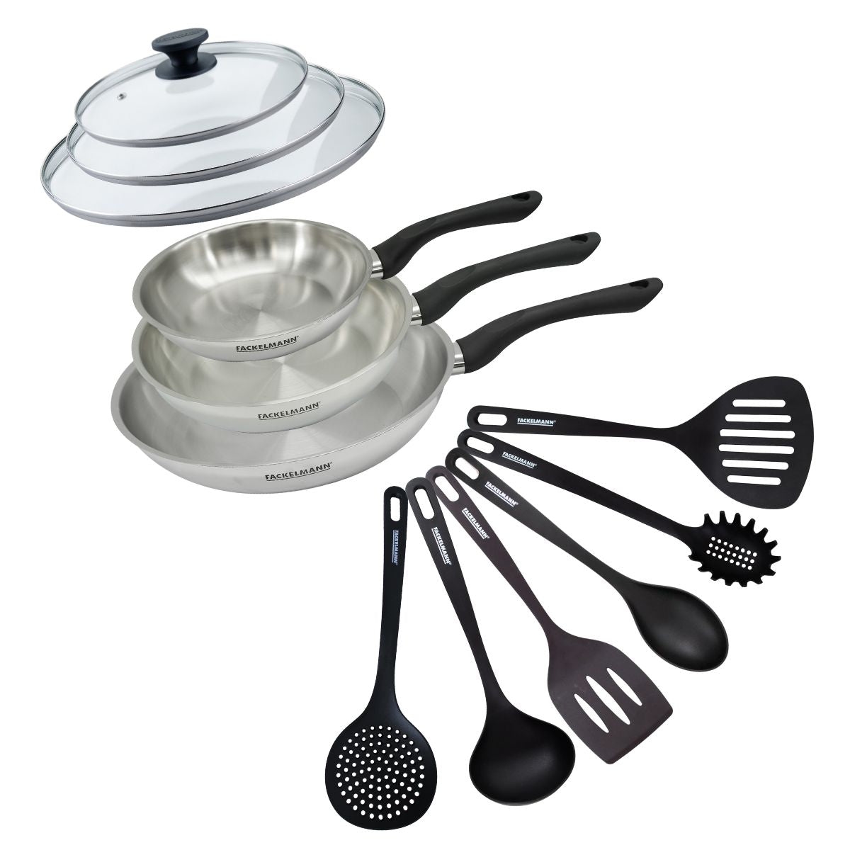 Set mit 3 Edelstahl-Bratpfannen 20, 24 und 28 cm, Glasdeckeln und 6 Fackelmann Geneva Utensilien