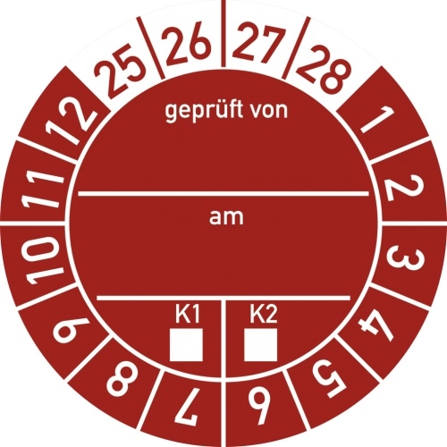 Dreifke® Prüfplakette geprüft von am K1/K2 2025 - 2028, Folie, Ø 30 mm, 10 Stück/Bogen