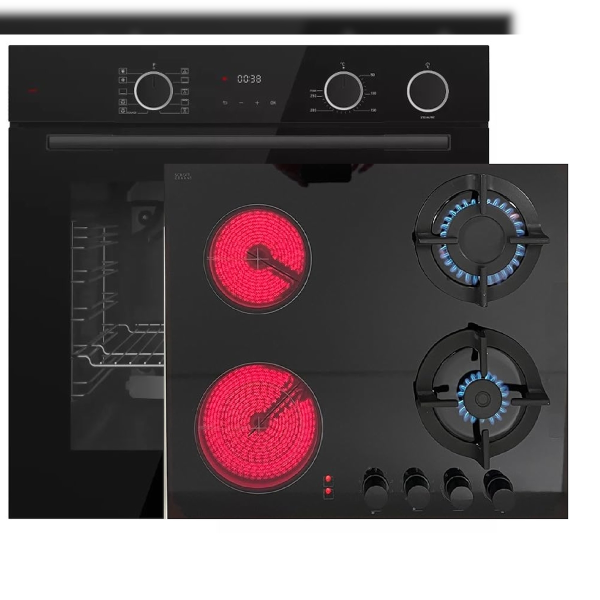 Boehme Böhme Einbauherdset Schwarzen Glas mit AirFry Funktion sowie Dampfunterstützung + Hybrid Kombi Gas Elektro Kochfeld 60 cm