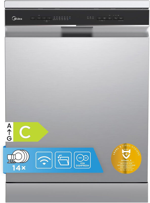 Midea MDWEF1433D(SS)-WG-UK Freestanding Full Size Dishwasher With Cutlery Tray, Stainless Steel, C Rated
