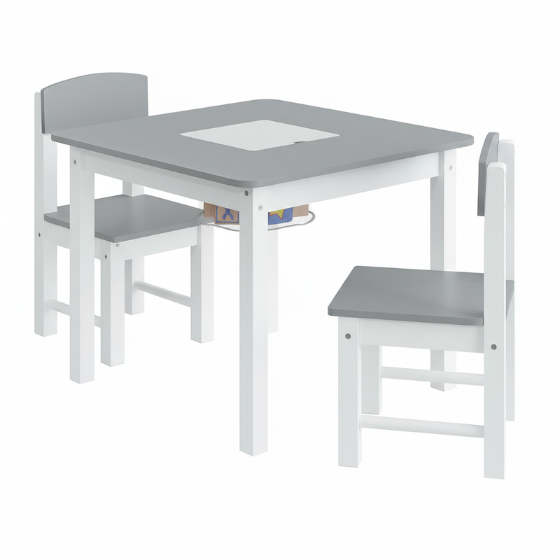 Lestarain Kindertisch-Set: 1 Tisch & 2 Stühle, Wendetischplatte, 2 Aufbewahrungskörbe, Weiß/Grau