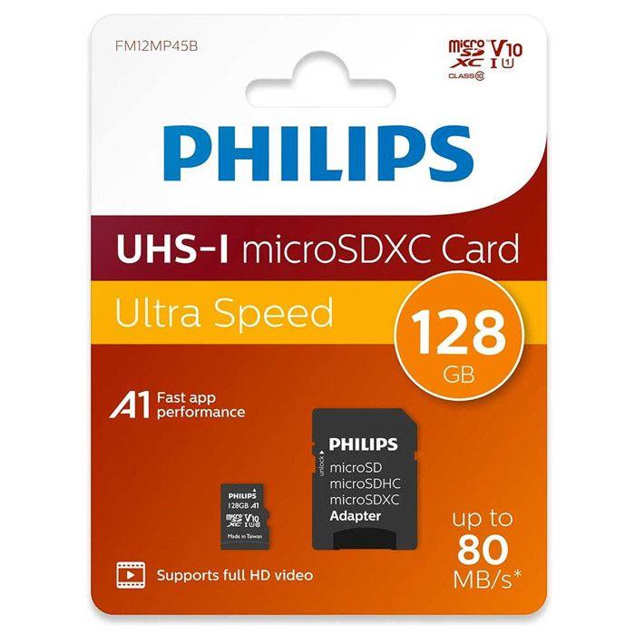 Philips Speicherkarte Micro SDXC 128GB Ultra Speed Lesegeschwindigkeit bis zu 80MB/s, A1 Schnelle App-Leistung, V10, mit Adapter
