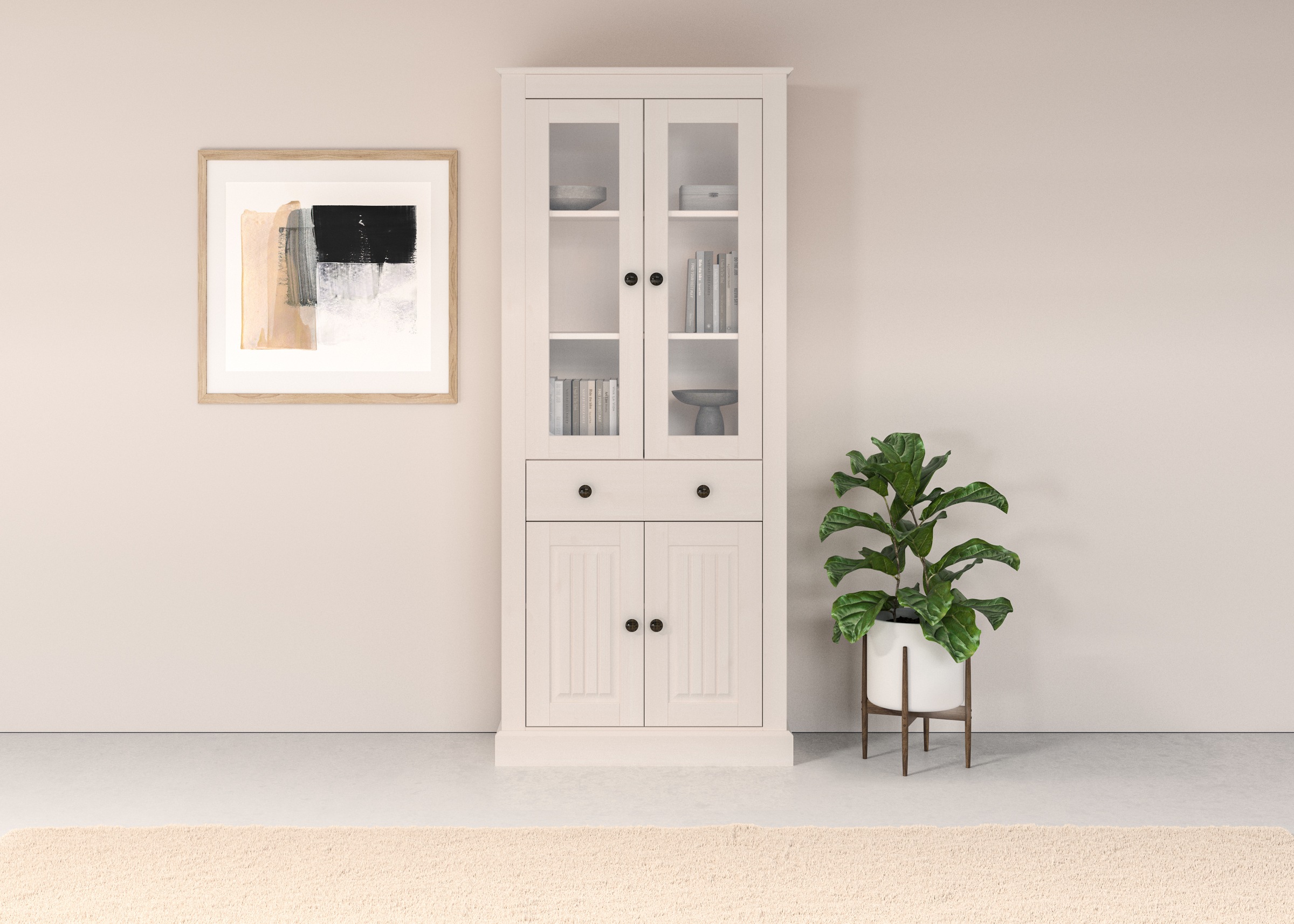 Vitrine GOODPRODUCT "Liotta", weiss (weiß), B:77cm H:181cm T:31cm, Massivholz, Schränke, Vitrine, Mit 2 Glastüren und 1 Schublade weiß weiss, B/H/T: 77cm x 181cm x 31cm, Schubladen: 2 Stk. Türen: 4 Stk.