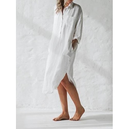 Per donna Blu Bianco Viola Estate Primavera Abito Midi Abito Bianco Abiti in cotone e lino Abito in lino Casual Quotidiano Vestibilità comoda Semplice Colletto a Camicia
