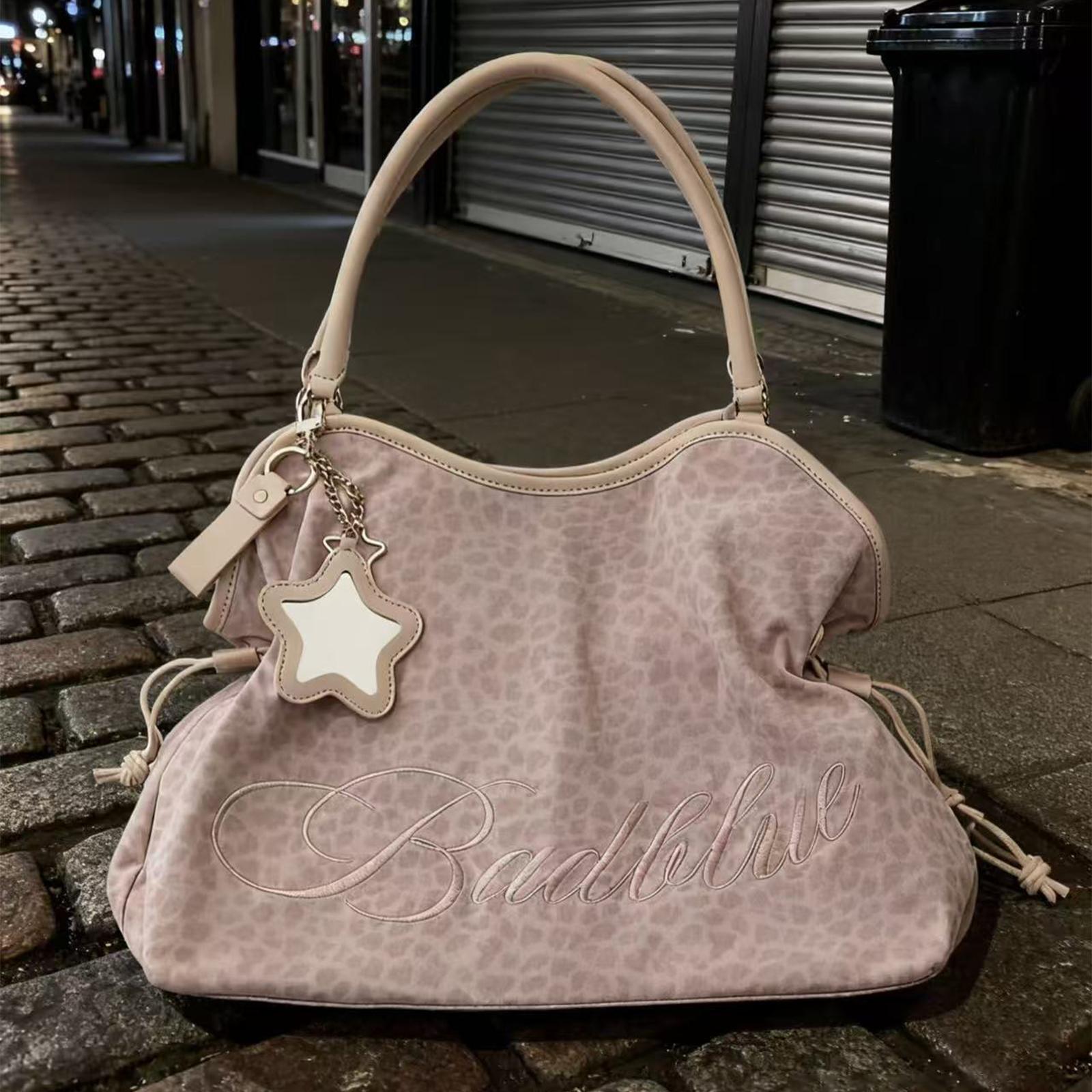 Korean BadBlue Embroidered Leopard Print Tote Bag Large Capacity Shoulder Bag with Star Mirror Pendant Y2K Trendy Women Handbag pink
