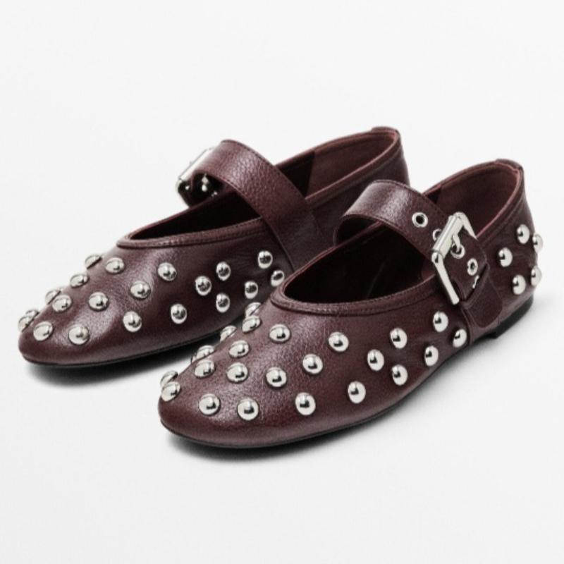 Burgundy Soft Leather Ballet Flats for Women Fashion Metal Rivets Decorated Mary Jane Shoes Elegant Belt Buckle Designer Shoes cm wine red