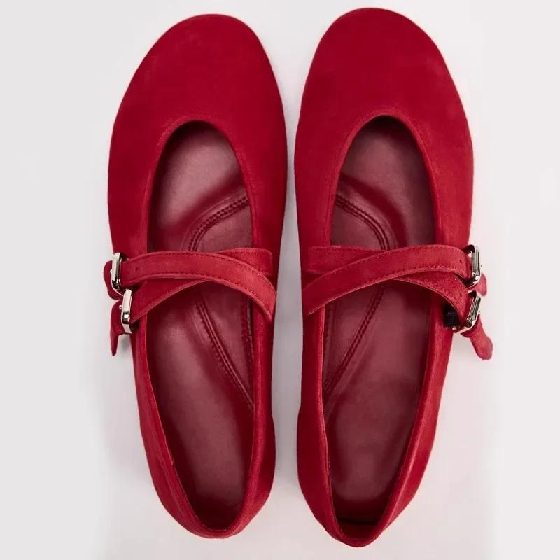 Spring Women's Ballet Flats Retro Red Double Belt Buckle Decoration Casual High Quality Big Size Lady Mary Jane Shoes cm red