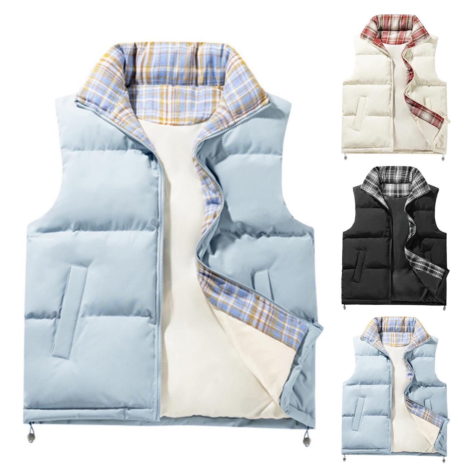 Men's And Women's Casual Inner And Outer Color-matched Checkered Vest. Men's Stand-up Collar Thickened Warm Zipper Sleeveless Vest cm beige