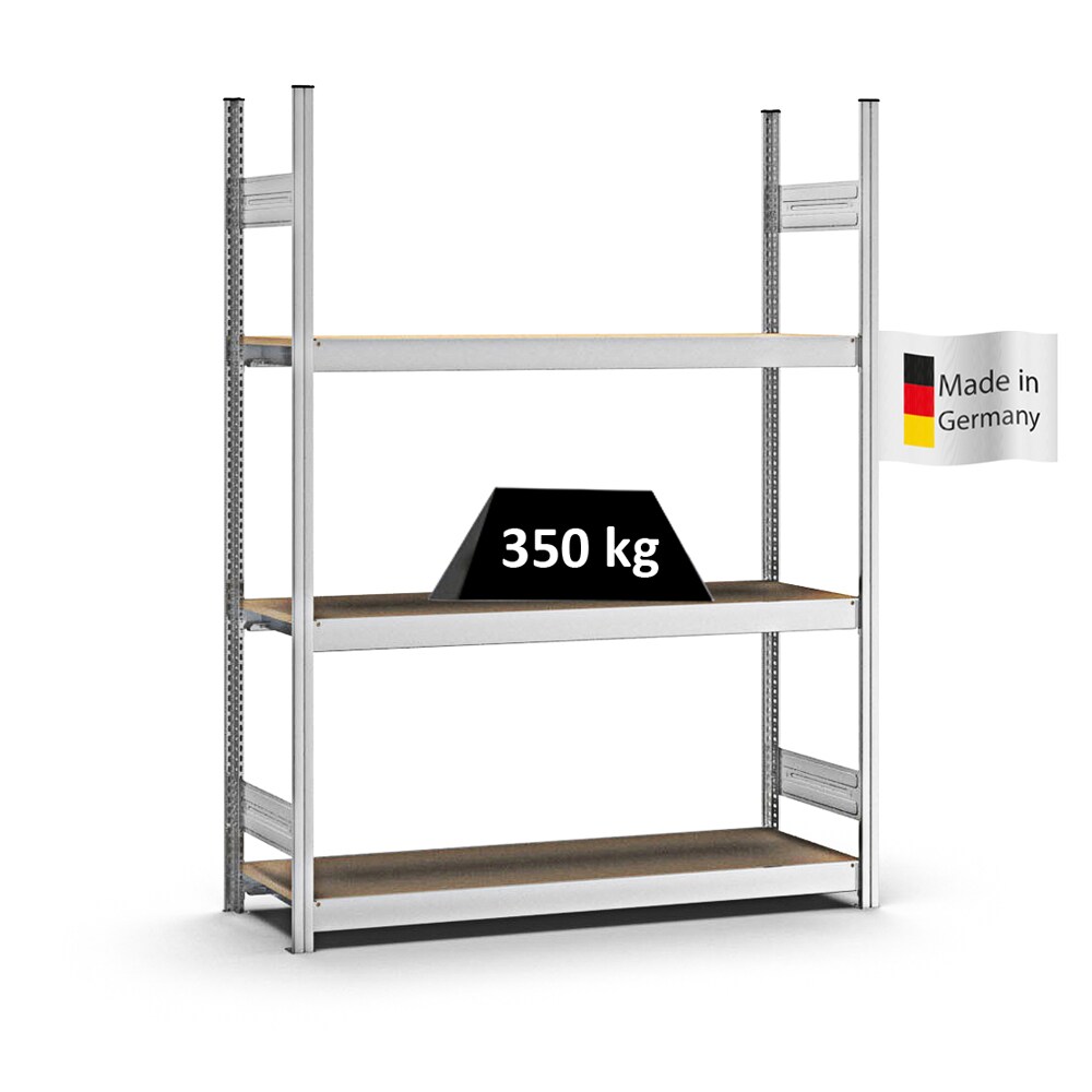 PROREGAL Weitspannregal Stecksystem T-Profil | HxBxT 250x150x80cm | 4 Ebenen | Spanplatten-Fachboden | Fachlast 350kg | Verzinkt | Lagerregal