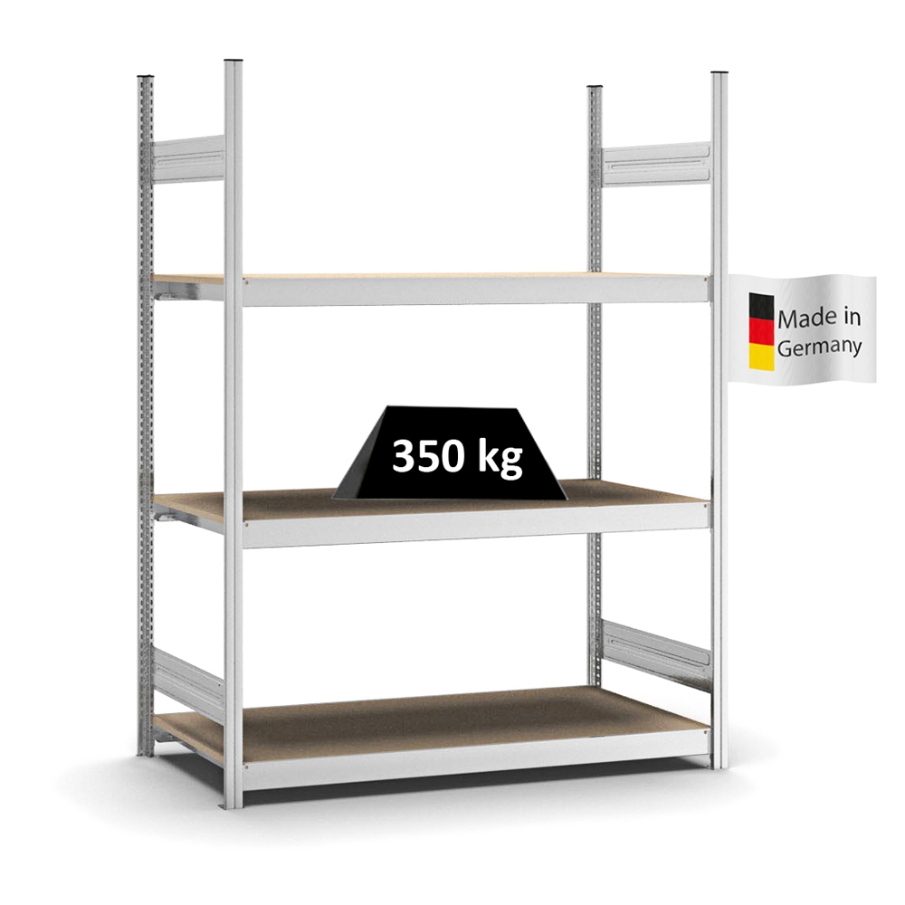 PROREGAL Weitspannregal Stecksystem T-Profil | HxBxT 200x150x60cm | 3 Ebenen | Spanplatten-Fachboden | Fachlast 350kg | Verzinkt | Lagerregal