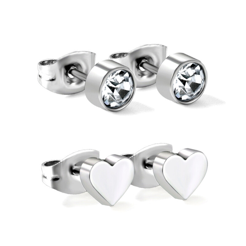2 Pairs Stainless Steel Stud Earrings Set – Round CZ Solitaire and Polished Heart Shaped Silver Tone Studs