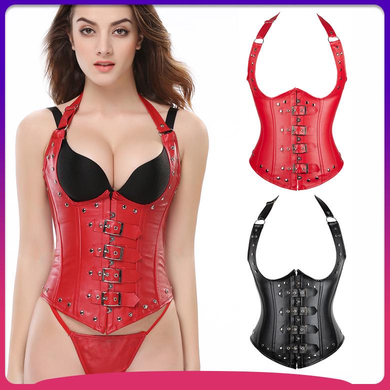 European & American Sexy Leather Corset: Steel Boned Rivet Waist Cincher Body Shaper cm red
