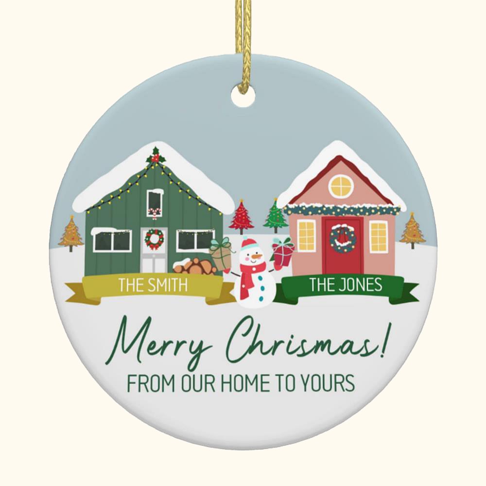 Personalizado From Our Home To Yours Cabin Snowman Adorno de cerámica con 2 nombres de familia Decoración del árbol de Navidad Regalo para la familia
