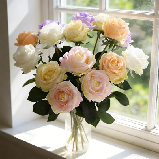 Artificial Realistic Rose Flower Real Touch Faux Silk Rose Bouquet Long Stem Fake Flower with Leaves for Home Wedding Party Table champagne