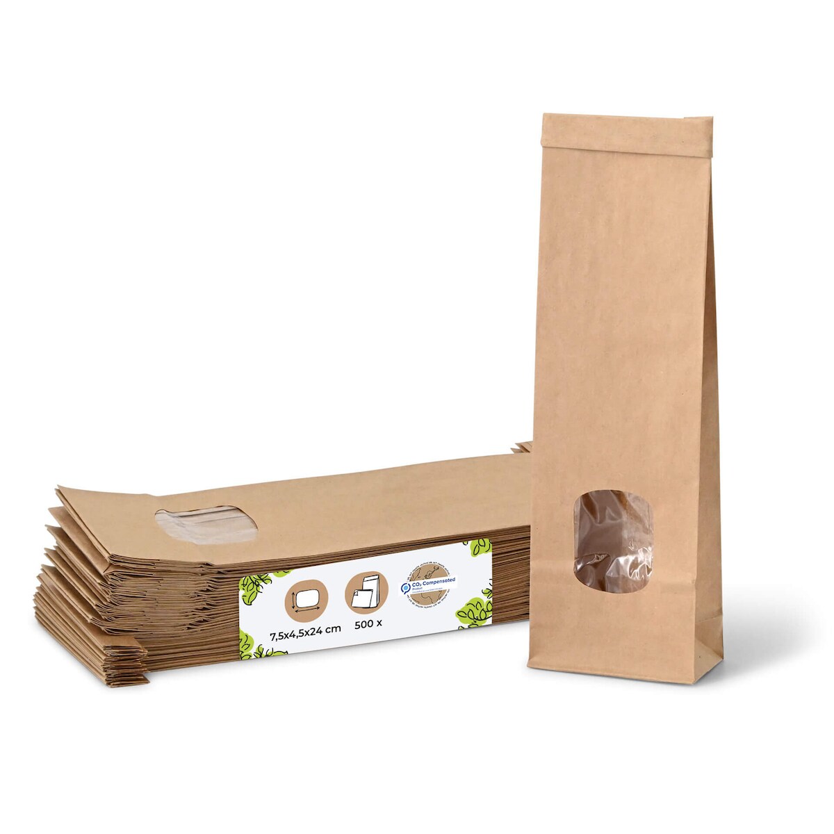 BIOZOYG 500 Stück Kraftpapiertüten 7,5 x 4,5 x 24 cm, Größe XS, braun, Papiersäckchen, Blockbeutel, mit Fenster, Papier-Geschenktüten mit Clip